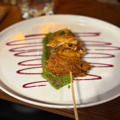 | Tender pieces of chicken served on a skewer, garnished with... | ||