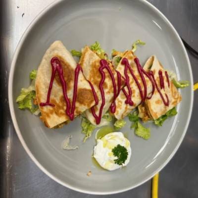 | Quesadilla slices filled with tikka-spiced ingredients, topp... | ||