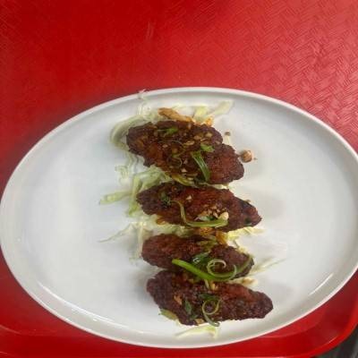 | Four seasoned chicken wings garnished with chopped green oni... | ||